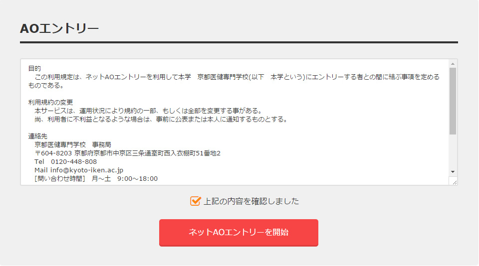 STEP.01ネットAOエントリーの「利用規定」を読んで、チェックを入れてエントリースタート!