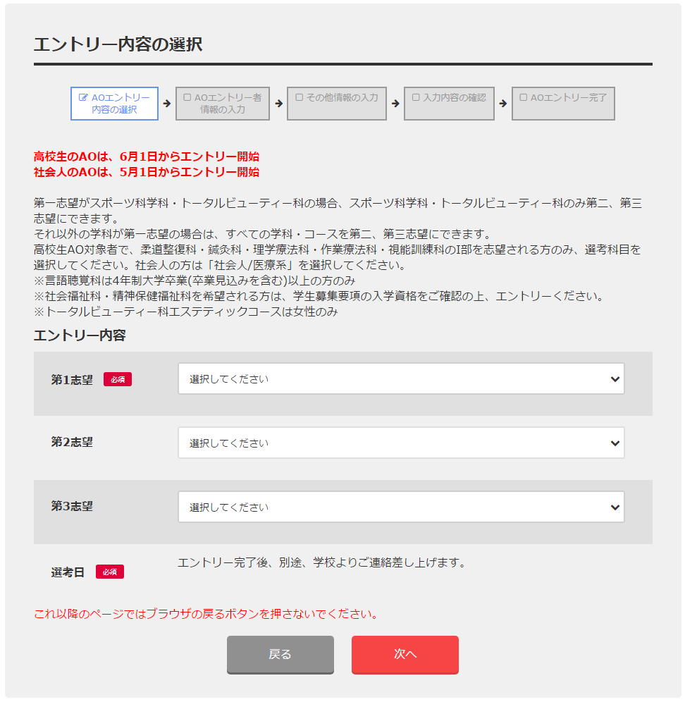 STEP.02志望する学科・コースを入力。AO入学の選考日を選んで、次へ